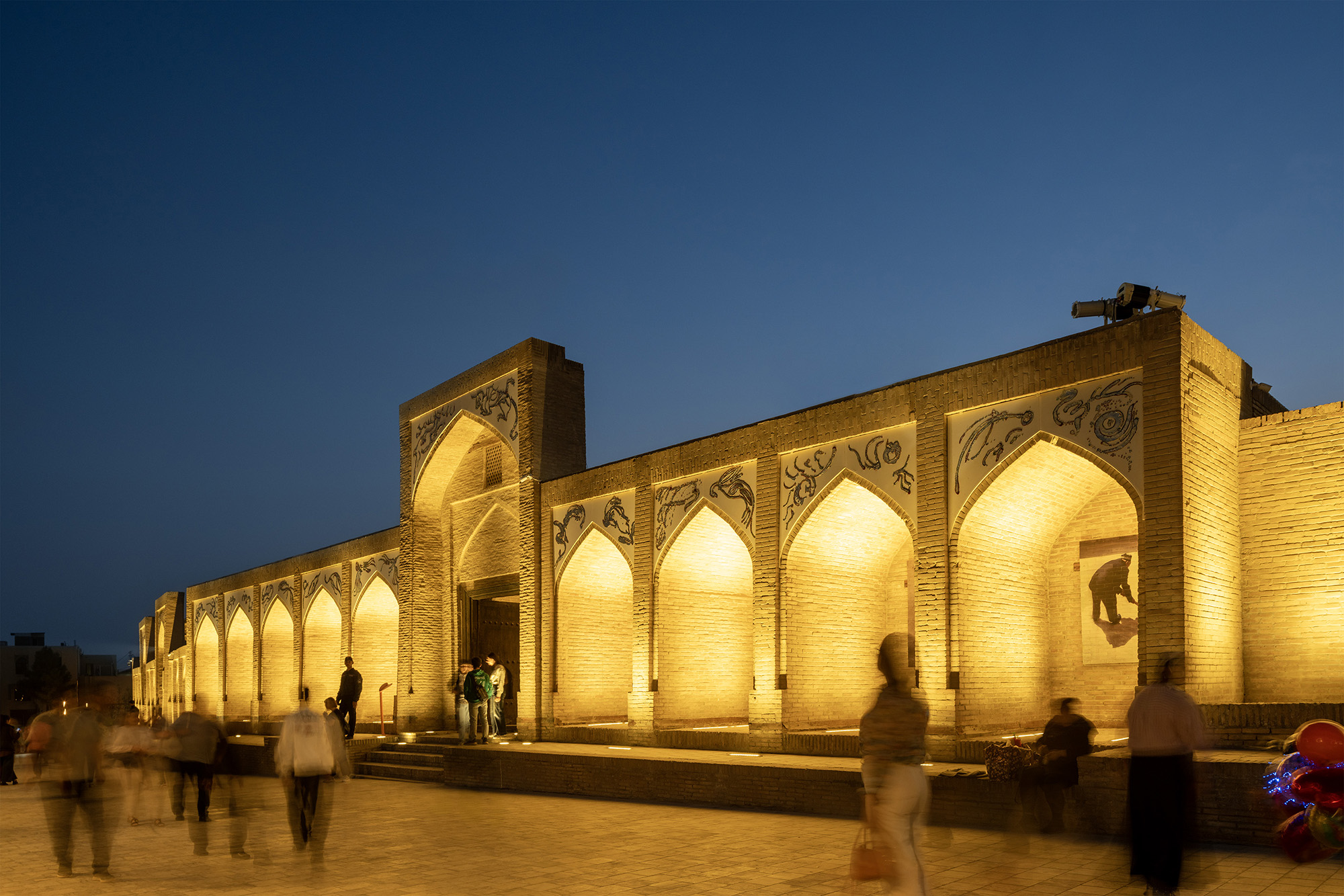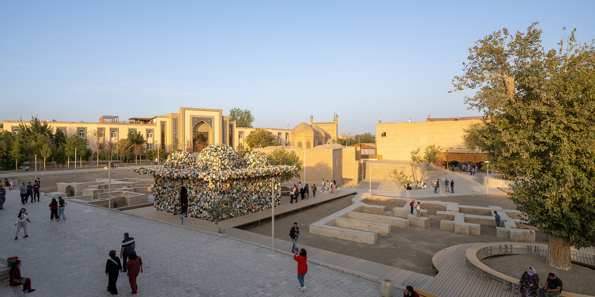 To develop the masterplan, on-site research with maps and photographic records was conducted , informing the decision to define routes for pedestrian circulation through the city, reconnect ground levels that varied across historical periods, unify the way materials are used, and create new lighting conditions. The restoration of courtyards and plazas was carried out to create space for activities and site-specific art installations at the biennial, as well as for future cultural events. The work relied on elements and techniques that have long been central to design, craft, and architecture in Bukhara, such as brick, limestone, plaster, tile, clay, and decorative terracotta. For example, antique bricks were used to construct all surfaces around the Magoki Attori mosque, with patterns that resemble pavements from the tenth century found at the Chor Bakr necropolis. Grounded in the architectural and craft traditions of the place, this approach highlights the potential of dynamic, adaptable renewal. The renovation of Bukhara is conceived as an open, ongoing process and a long-term project for a city, one that is enduring but ever changing.