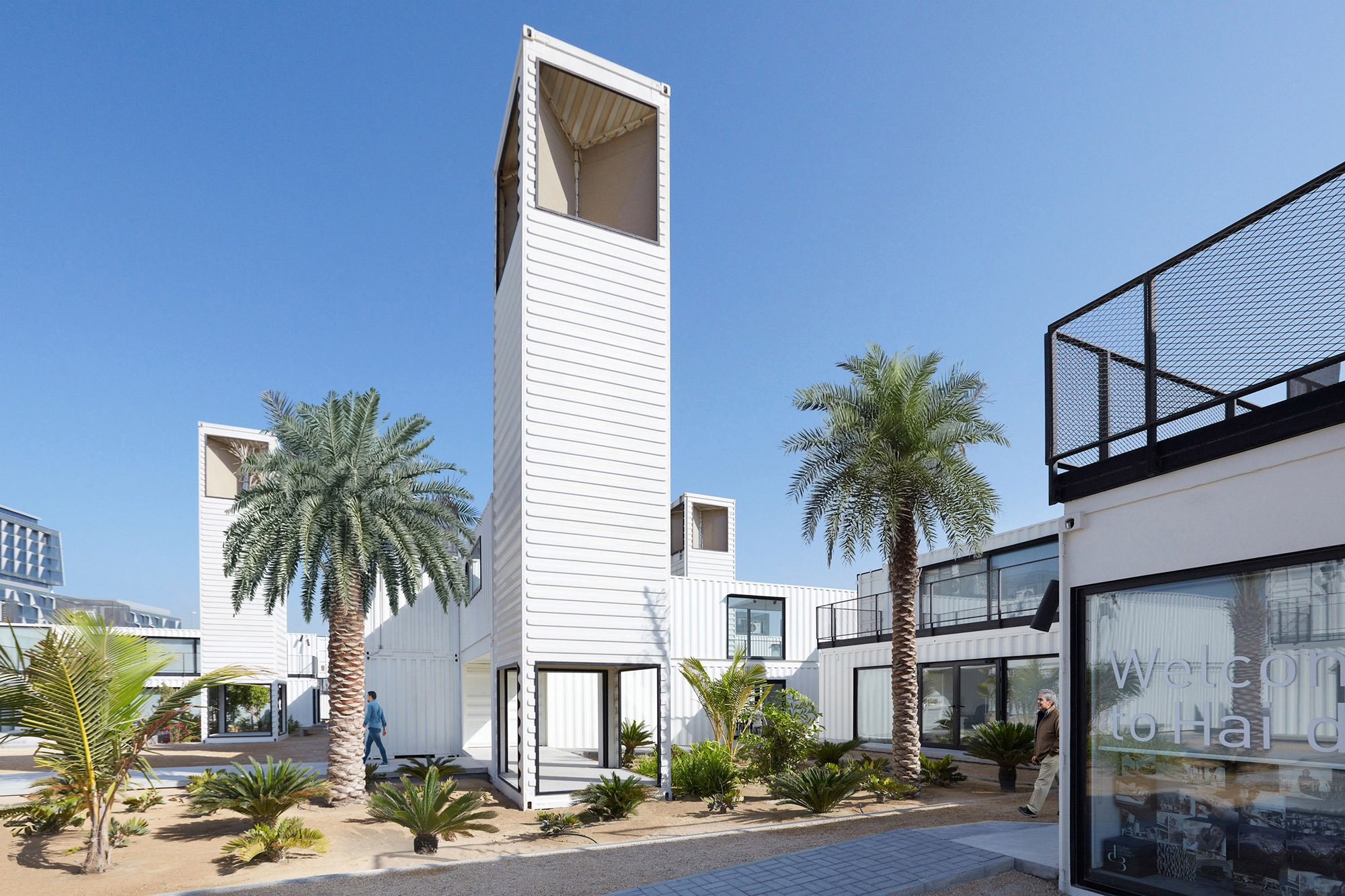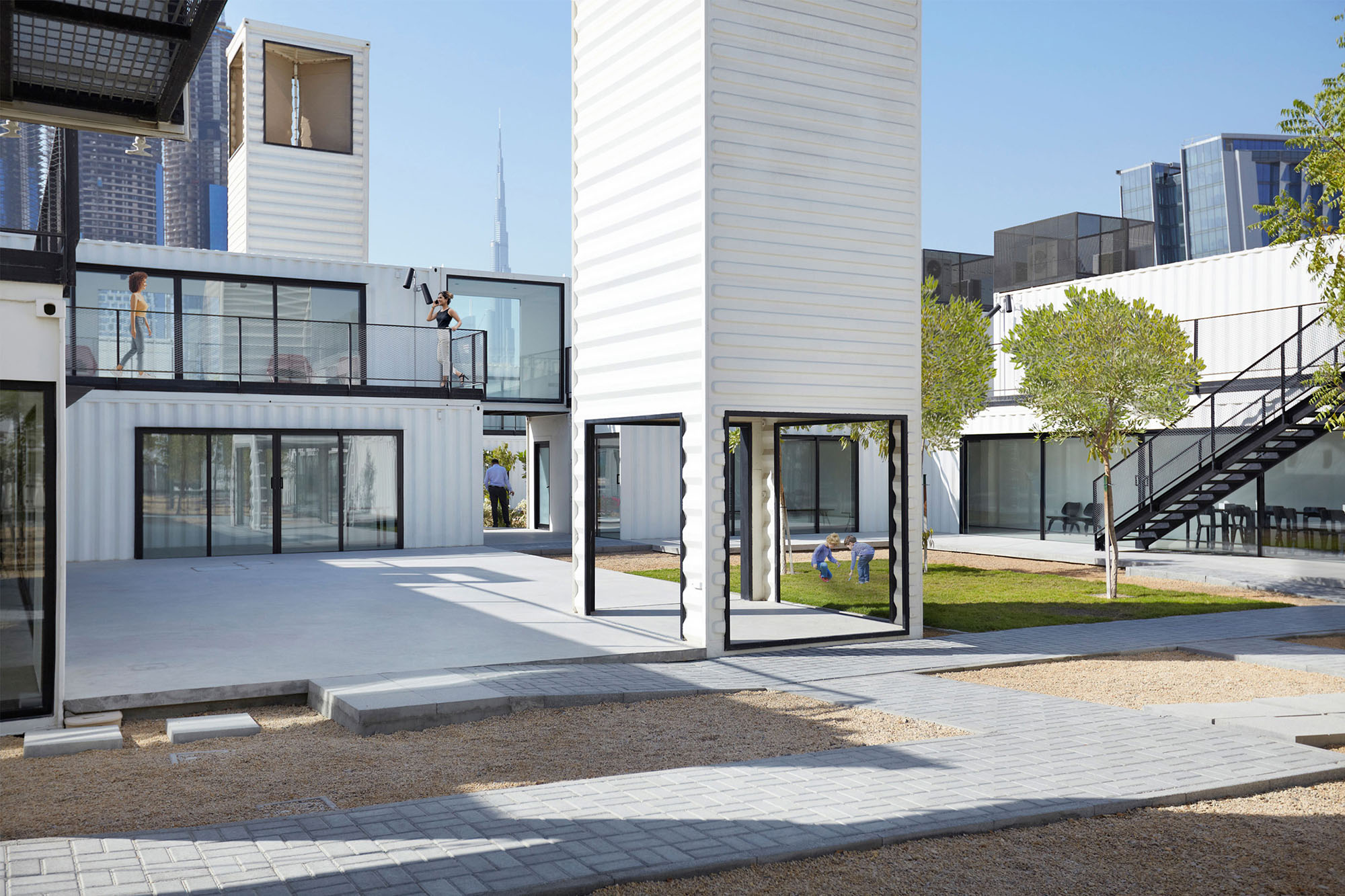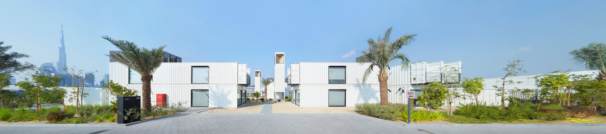 The project is a contemporary reinterpretation of the traditional Arabic neighbourhood, while capturing the expansion and contraction of streets (hayy) in the historic Arabic city. The design is punctuated by the sahat: vibrant, public “plazas” for neighbourhood interaction, activity, and gathering. These landscaped, “urban” plaza spaces were designed in parallel with the physical architecture, performing as spatial extensions of the building interiors. By using full-height windows and strategic material transparencies, the architecture establishes inside-outside connections to the landscape greenery, frames views of the Dubai skyline, and enhances productivity within naturally-lit spaces. Collectively, the project was composed as a modular system of 75, 40-foot shipping containers, in six different stacking arrangements. Given that Dubai is a port city with a changing urban fabric, the shipping containers are a logical material expression of the city and its context.