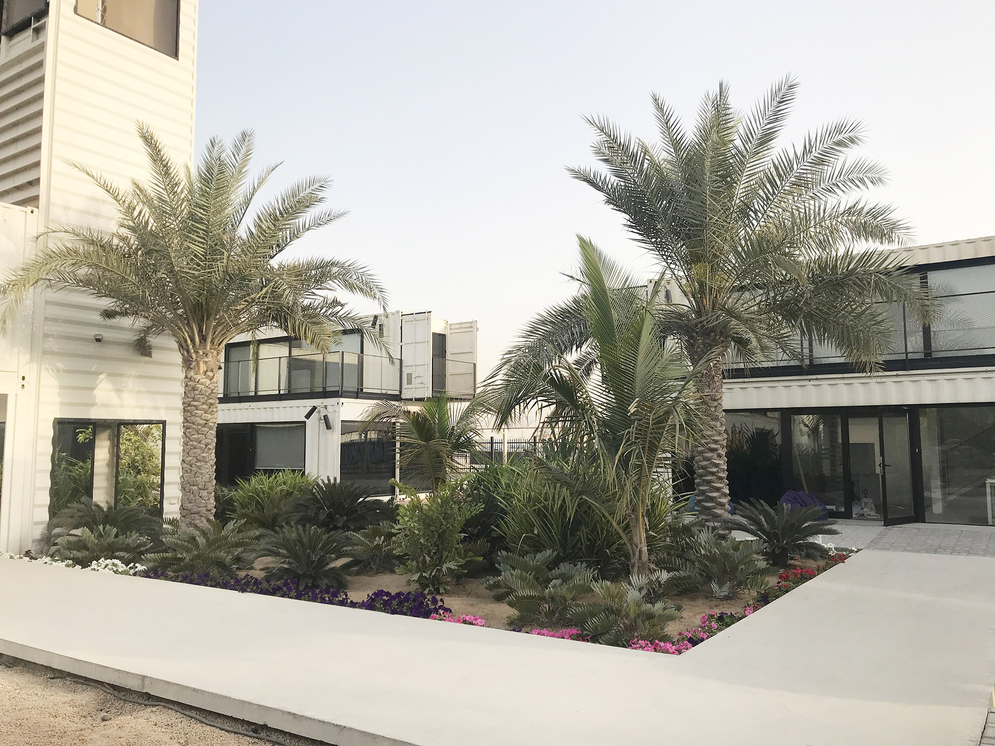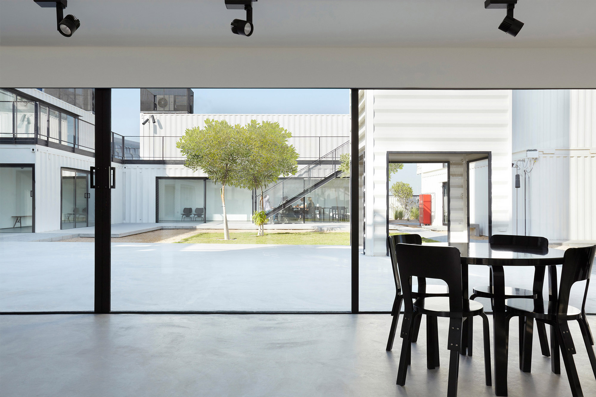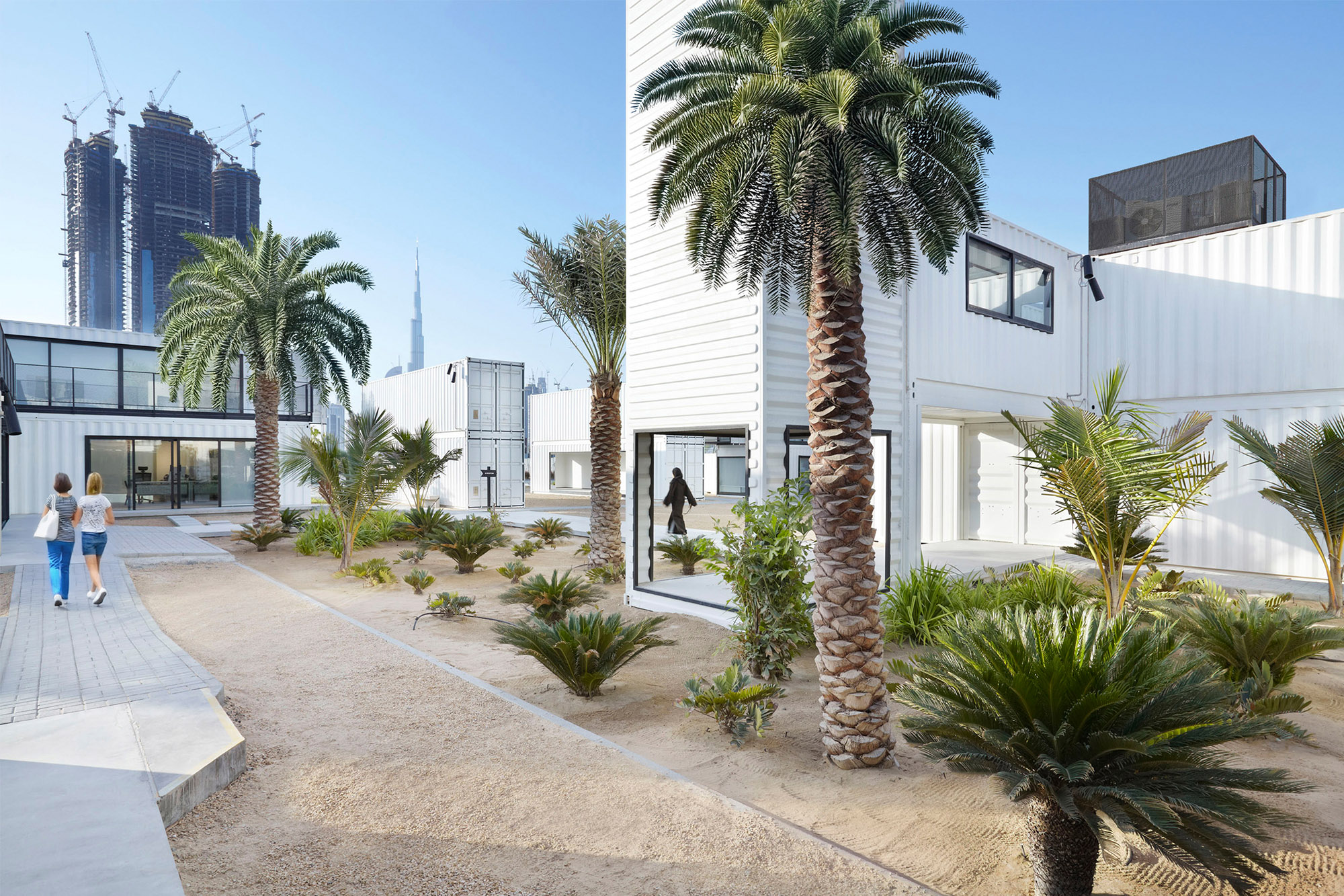 The project is a contemporary reinterpretation of the traditional Arabic neighbourhood, while capturing the expansion and contraction of streets (hayy) in the historic Arabic city. The design is punctuated by the sahat: vibrant, public “plazas” for neighbourhood interaction, activity, and gathering. These landscaped, “urban” plaza spaces were designed in parallel with the physical architecture, performing as spatial extensions of the building interiors. By using full-height windows and strategic material transparencies, the architecture establishes inside-outside connections to the landscape greenery, frames views of the Dubai skyline, and enhances productivity within naturally-lit spaces. Collectively, the project was composed as a modular system of 75, 40-foot shipping containers, in six different stacking arrangements. Given that Dubai is a port city with a changing urban fabric, the shipping containers are a logical material expression of the city and its context.